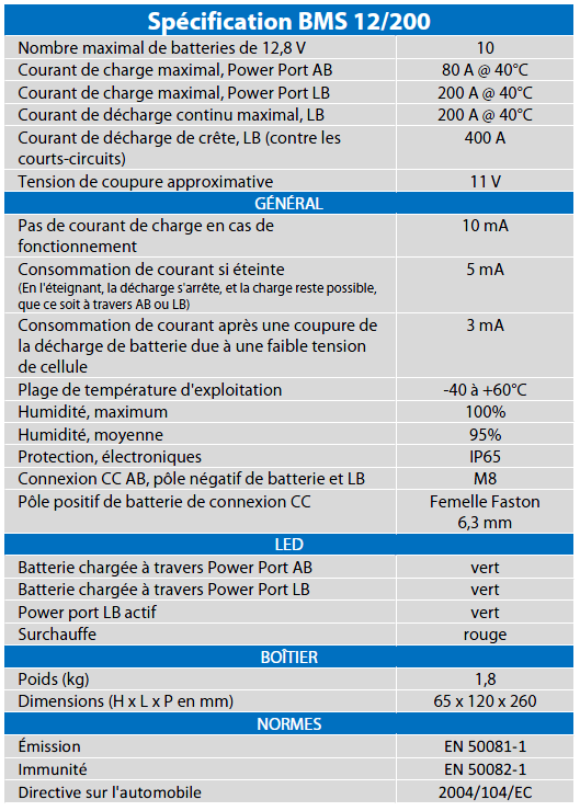 BMS 12/200 pour des batteries lithium fer phosphate de 12,8 Volt, qui protège l'alternateur (et le câblage), et fournit jusqu'à 200 A sur n'importe quelle charge CC (y compris des convertisseurs et des convertisseurs/chargeurs)